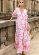 يجسد هذا الفستان الطويل المزهر روح البوهيمية الأنيقة بشكل مثالي. تصميمه الزهري الرقيق وقصته الانسيابية توفران مظهراً أنيقاً وطبيعياً. خفيف ومريح، هو مثالي للأيام المشمسة، والنزهات الصيفية أو الأمسيات غير الرسمية.