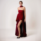 Tato elegantní dlouhá šaty mají asymetrický střih s vysokým a nízkým lemem a překrytím, které dodává hloubku a pohyb. Detail integrovaného šátku se jemně omotává kolem krku nebo se drapí na rameni pro sofistikovaný vzhled. Vyrobené z lehké tkaniny, nabízejí plynulou a pohodlnou siluetu.