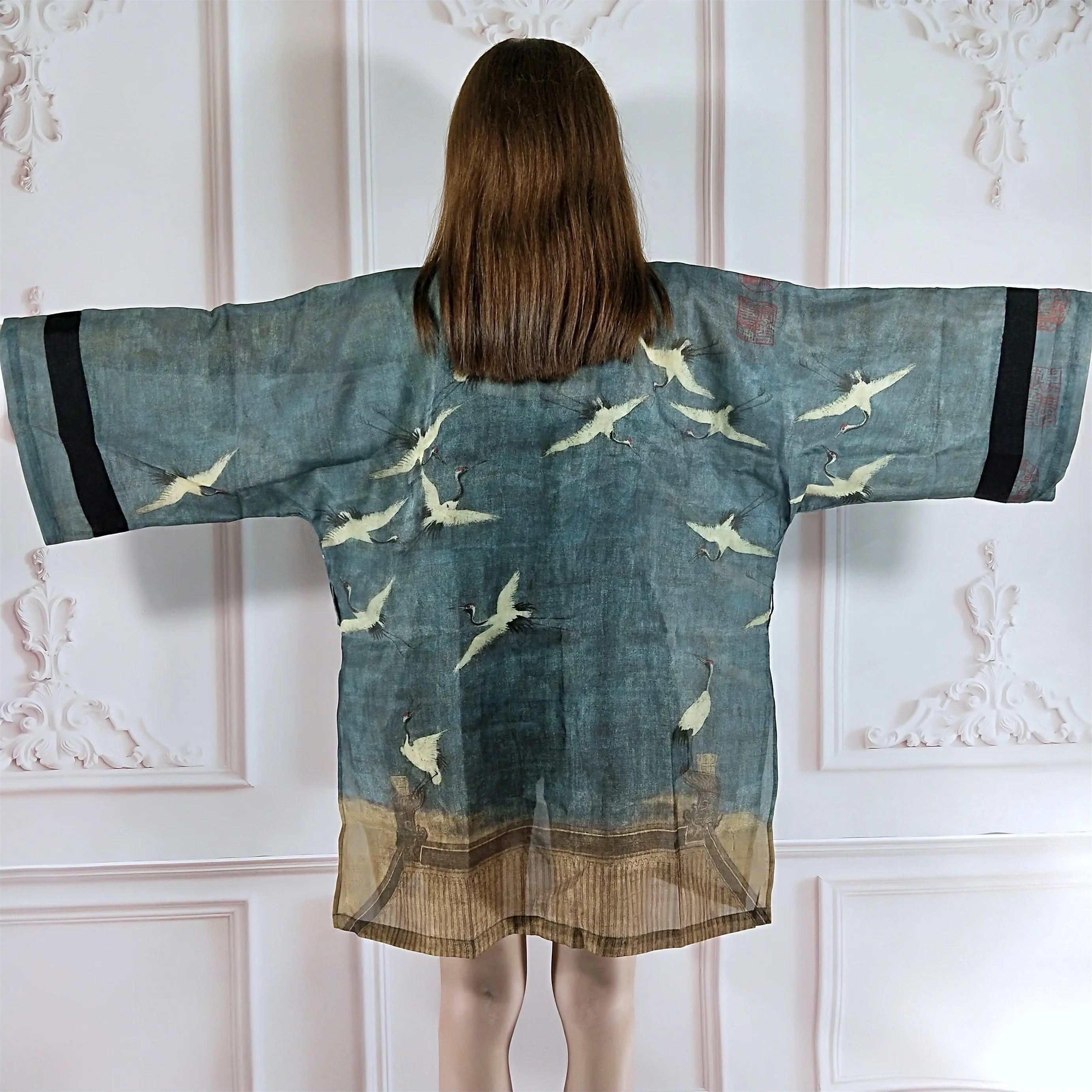 Rim-Lyserød | Kimono Jakke med Japanske Fuglemønstre