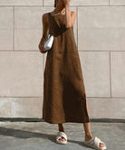 Αυτό το μακρύ φόρεμα γοητεύει με τον μινιμαλιστικό του στυλ και την ρευστή του πτώση που αναδεικνύει τη σιλουέτα φυσικά. Η καθαρή του γραμμή και οι διακριτικές πλευρικές σχισμές το καθιστούν ένα τέλειο κομμάτι για να συνδυάσετε άνεση και εκλεπτυσμένο στυλ. Ελαφρύ και ευχάριστο στη φορά, προσαρμόζεται εξίσου καλά σε ηλιόλουστες μέρες και σε στιγμές χαλάρωσης στις διακοπές.