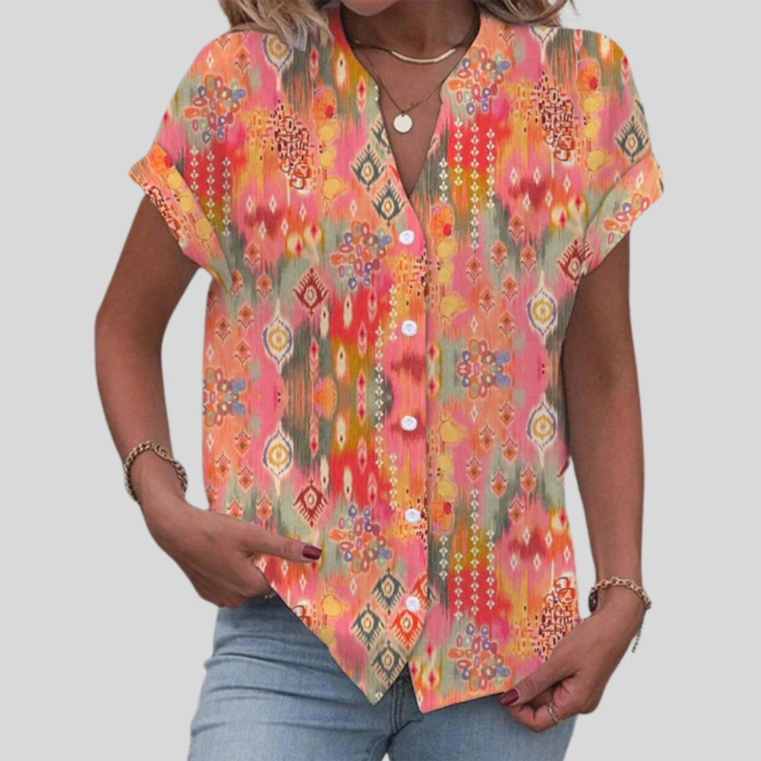 Αυτή η κομψή μπλούζα διαθέτει ένα ζωντανό μποχέμ εκτύπωμα. Η φαρδιά της γραμμή και το V-ντεκολτέ προσφέρουν άνεση. Ιδανική για διάφορες περιστάσεις, συνδυάζεται εύκολα με διαφορετικά παντελόνια.