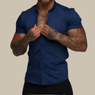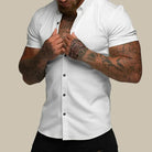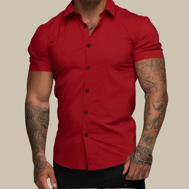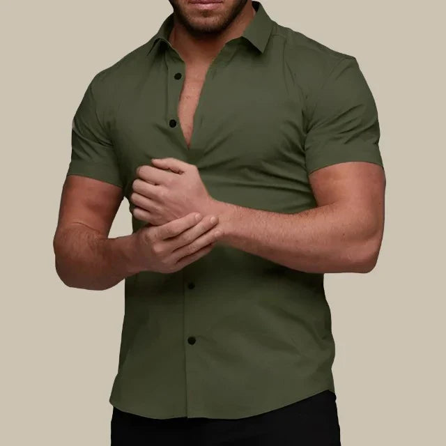 Αυτή η εφαρμοστή πουκαμίσα συνδυάζει τη σύγχρονη κομψότητα και την άνεση. Κατασκευασμένη από premium ελαστικά υλικά, προσφέρει ευελιξία και εκλεπτυσμένη εμφάνιση. Τα κοντά μανίκια παρέχουν μια κομψή και χαλαρή γραμμή, ιδανική για ζεστές μέρες.