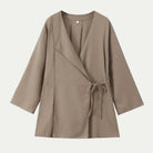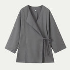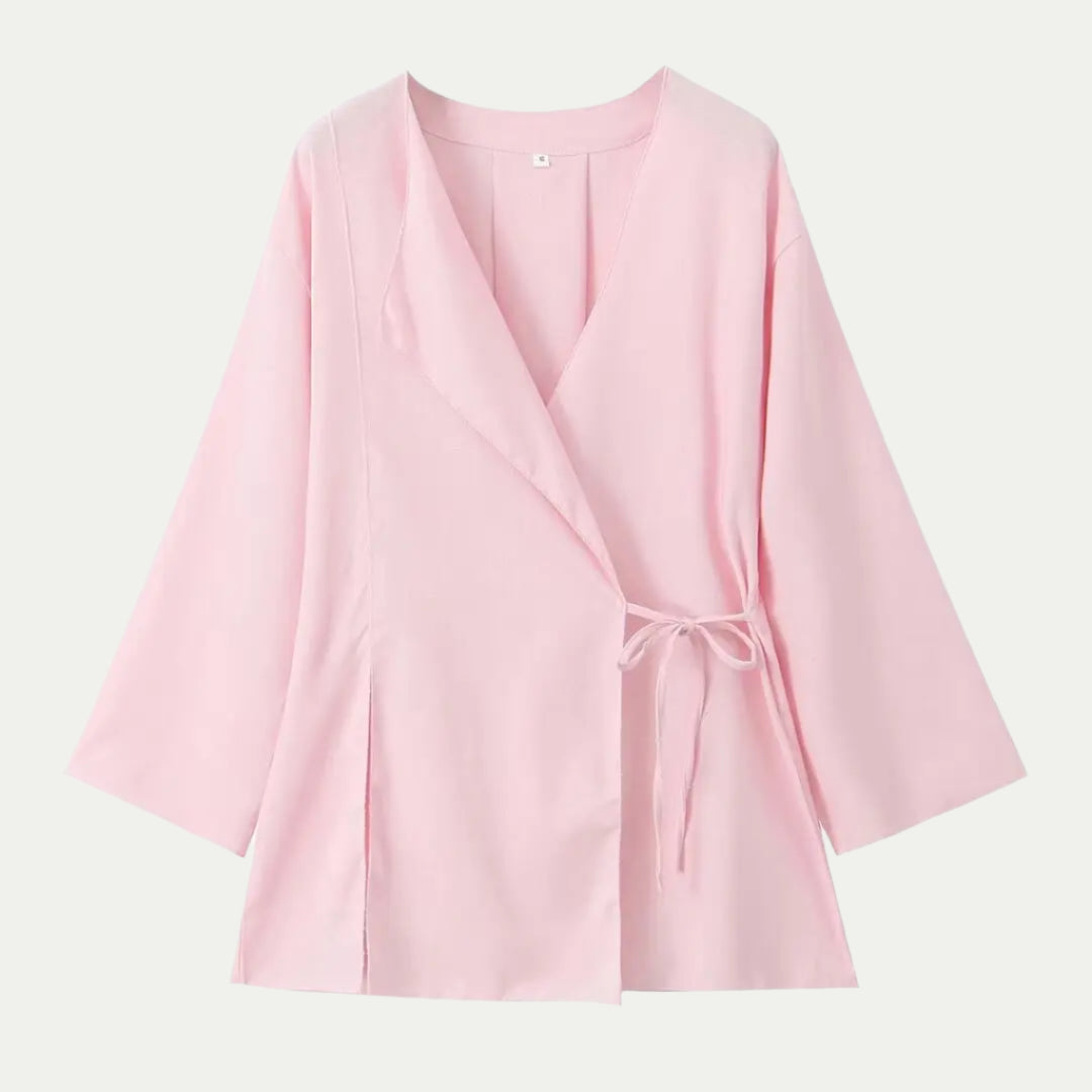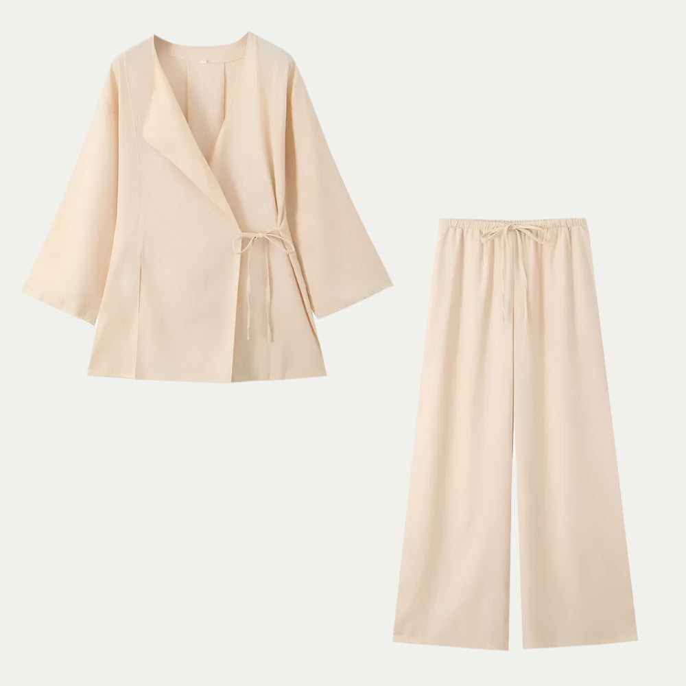 Αυτό το σετ συνδυάζει ένα πουκάμισο στυλ κιμονό με φαρδιά μανίκια και ένα παντελόνι ψηλής μέσης με φαρδιές γραμμές για μια ρευστή και κομψή εμφάνιση. Ελαφρύ και άνετο, είναι ιδανικό για ζεστές ημέρες. Διαθέσιμο σε πολλές αποχρώσεις, συνδυάζει καλοκαιρινό στυλ και ελευθερία κινήσεων.