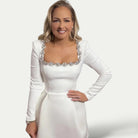 Αυτή η φόρεμα με τετράγωνη λαιμόκοψη ενσωματώνει την τέλεια ισορροπία μεταξύ απλότητας και εκλέπτυνσης. Η δομημένη κοπή κολακεύει τη σιλουέτα, ενώ τα μακριά μανίκια προσθέτουν μια πινελιά διαχρονικής χάρης. Ιδανική για επίσημες περιστάσεις ή κομψές βραδιές.