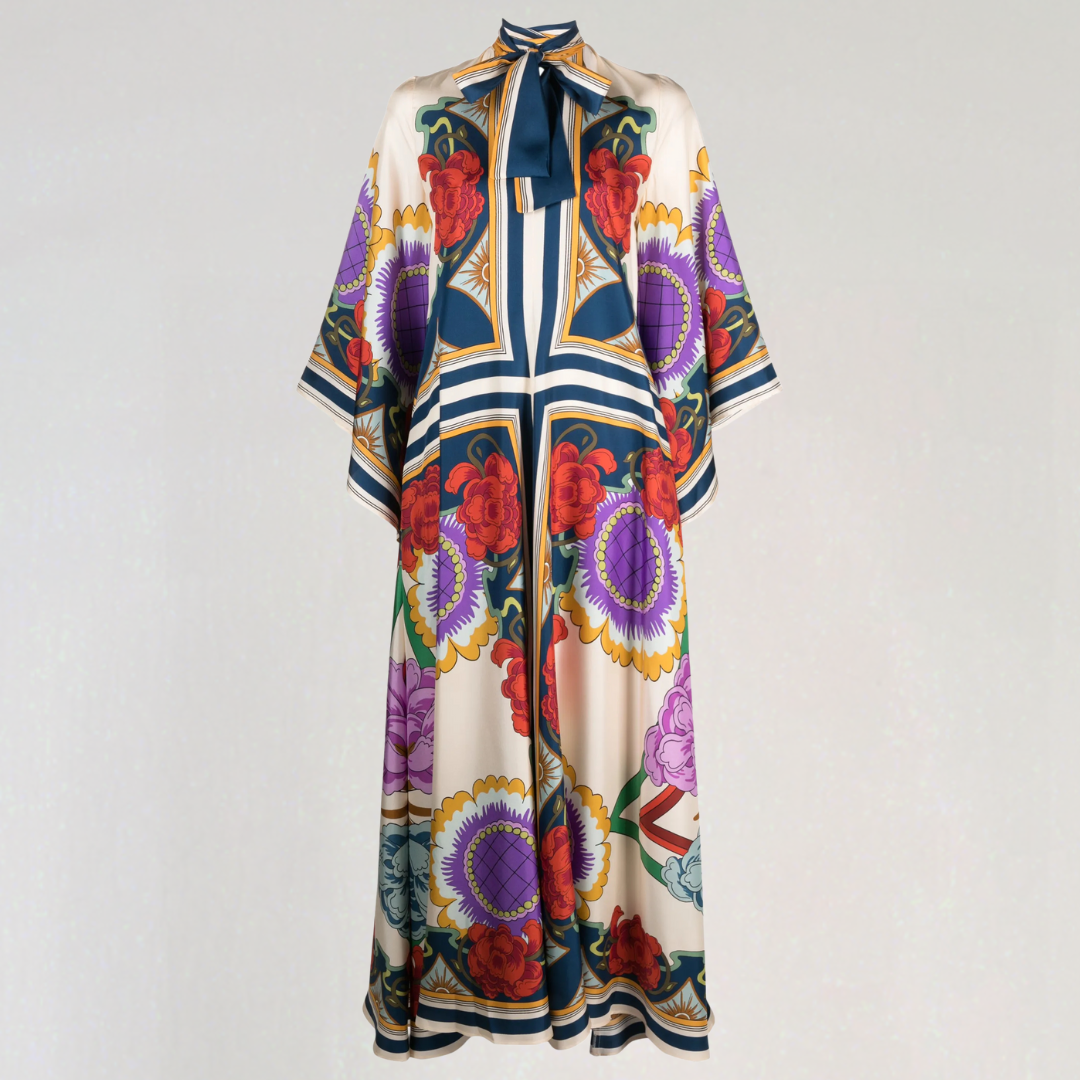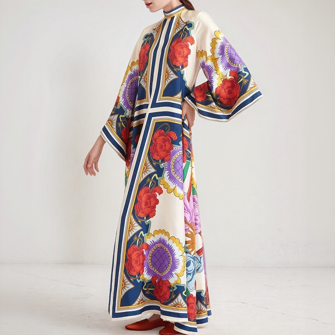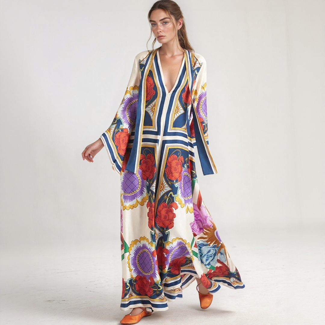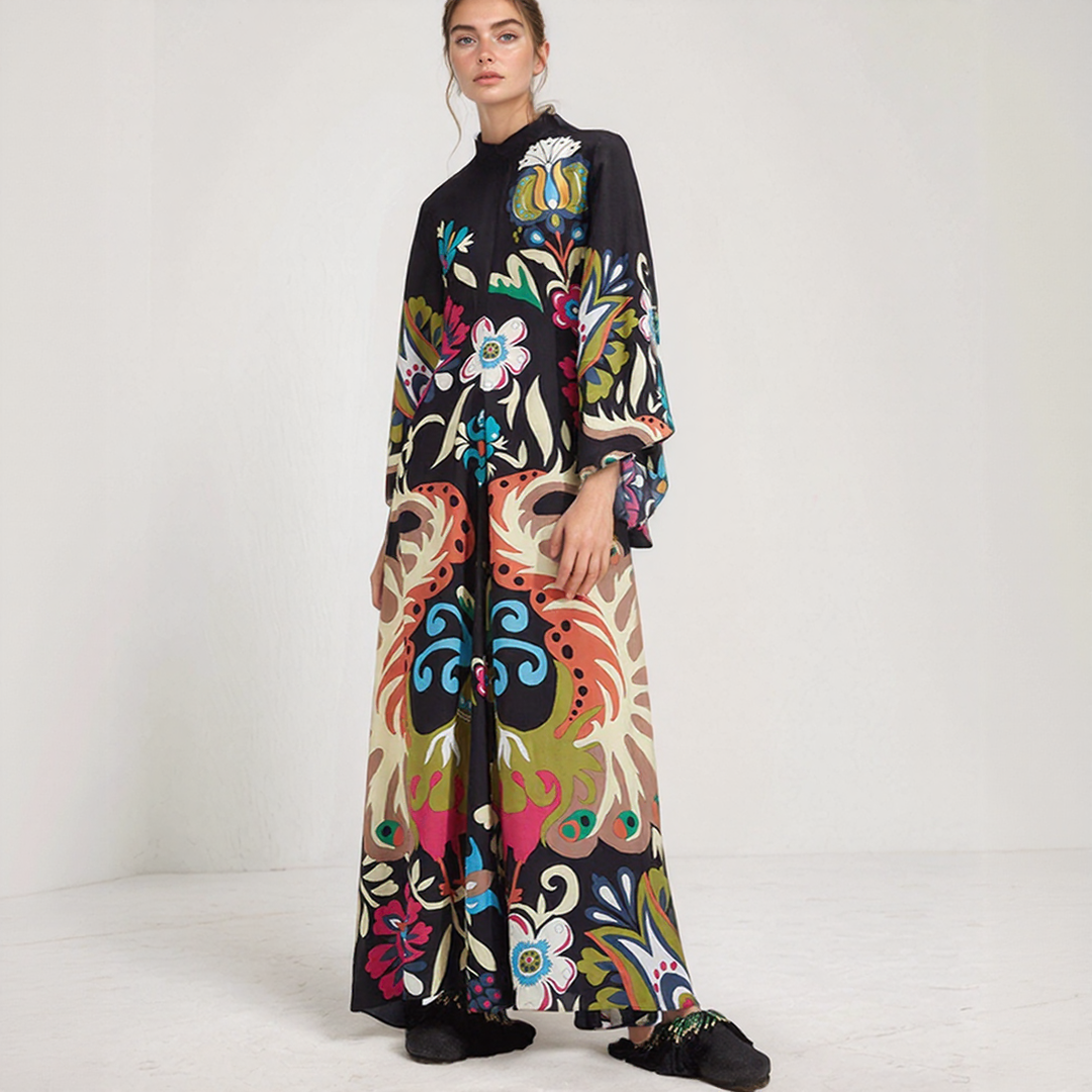 This long dress features bold floral patterns and a flowing cut. Its high collar with a bow detail at the back adds a sophisticated touch. Perfect for all seasons, it offers timeless bohemian elegance.