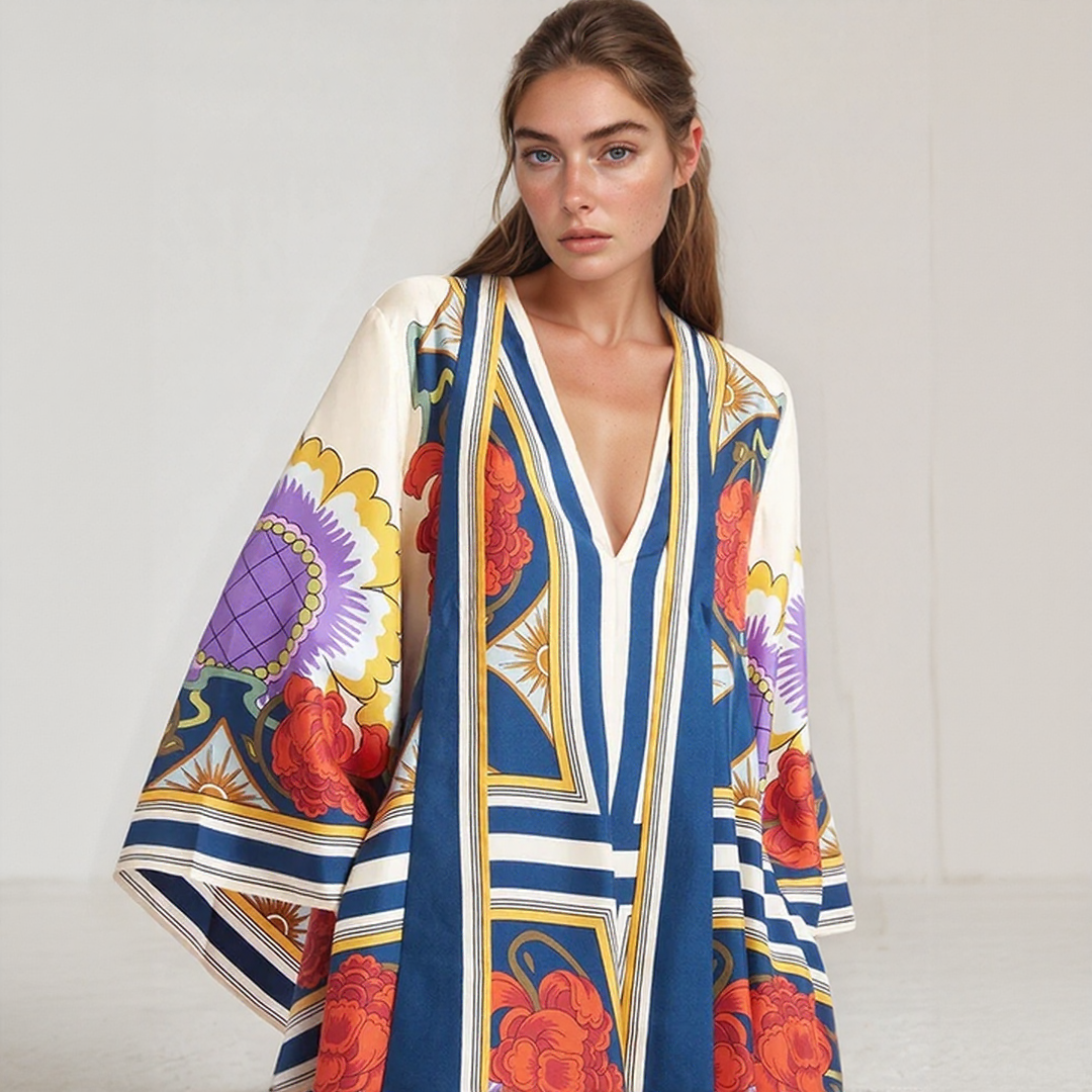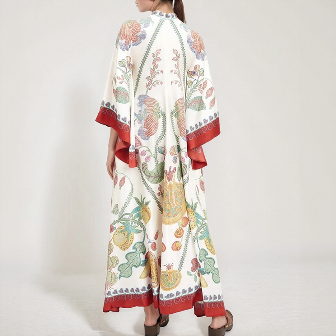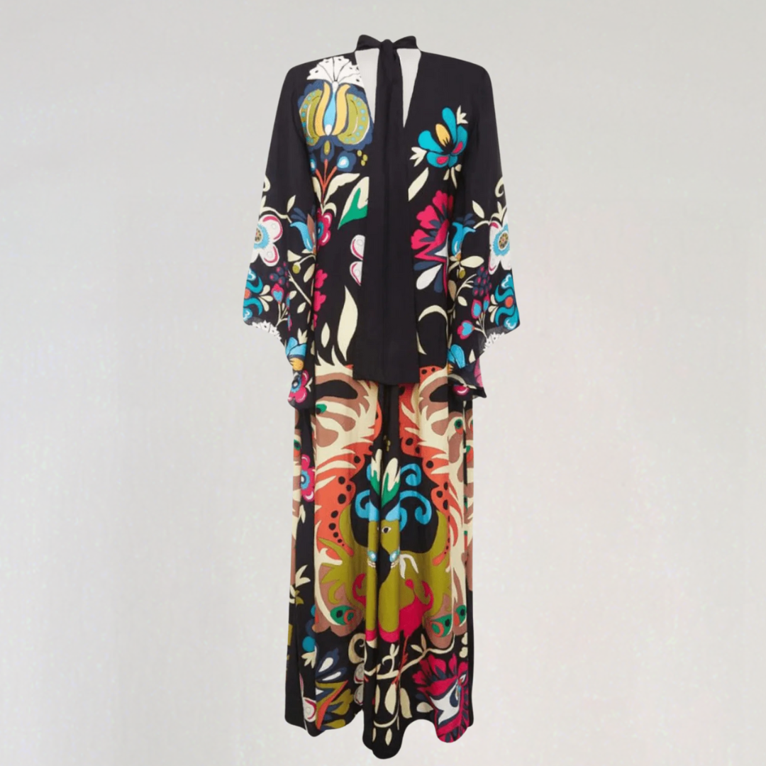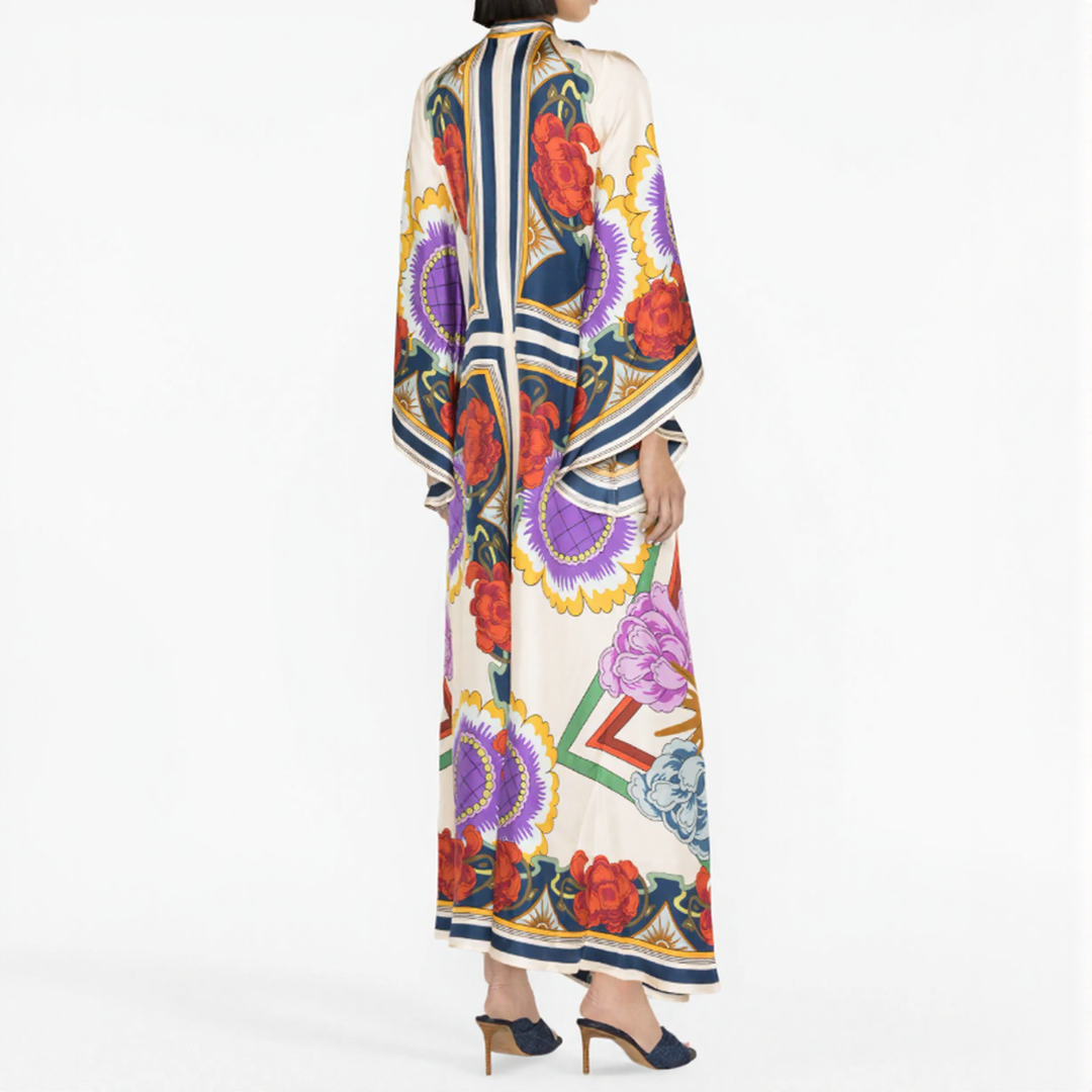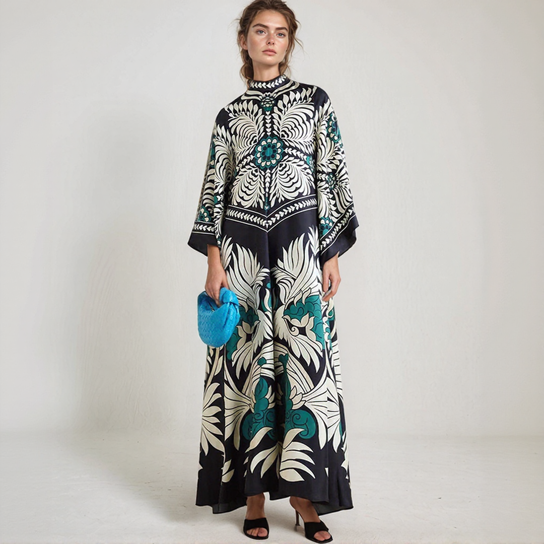 This long dress features bold floral patterns and a flowing cut. Its high collar with a bow detail at the back adds a sophisticated touch. Perfect for all seasons, it offers timeless bohemian elegance.