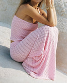 Questo completo femminile abbina un top senza spalline a una gonna lunga a righe rosa e bianche. La sua vestibilità fluida e leggera lo rende un'outfit ideale per le giornate di sole. Perfetto per le tue occasioni estive, combina comfort ed eleganza con stile.