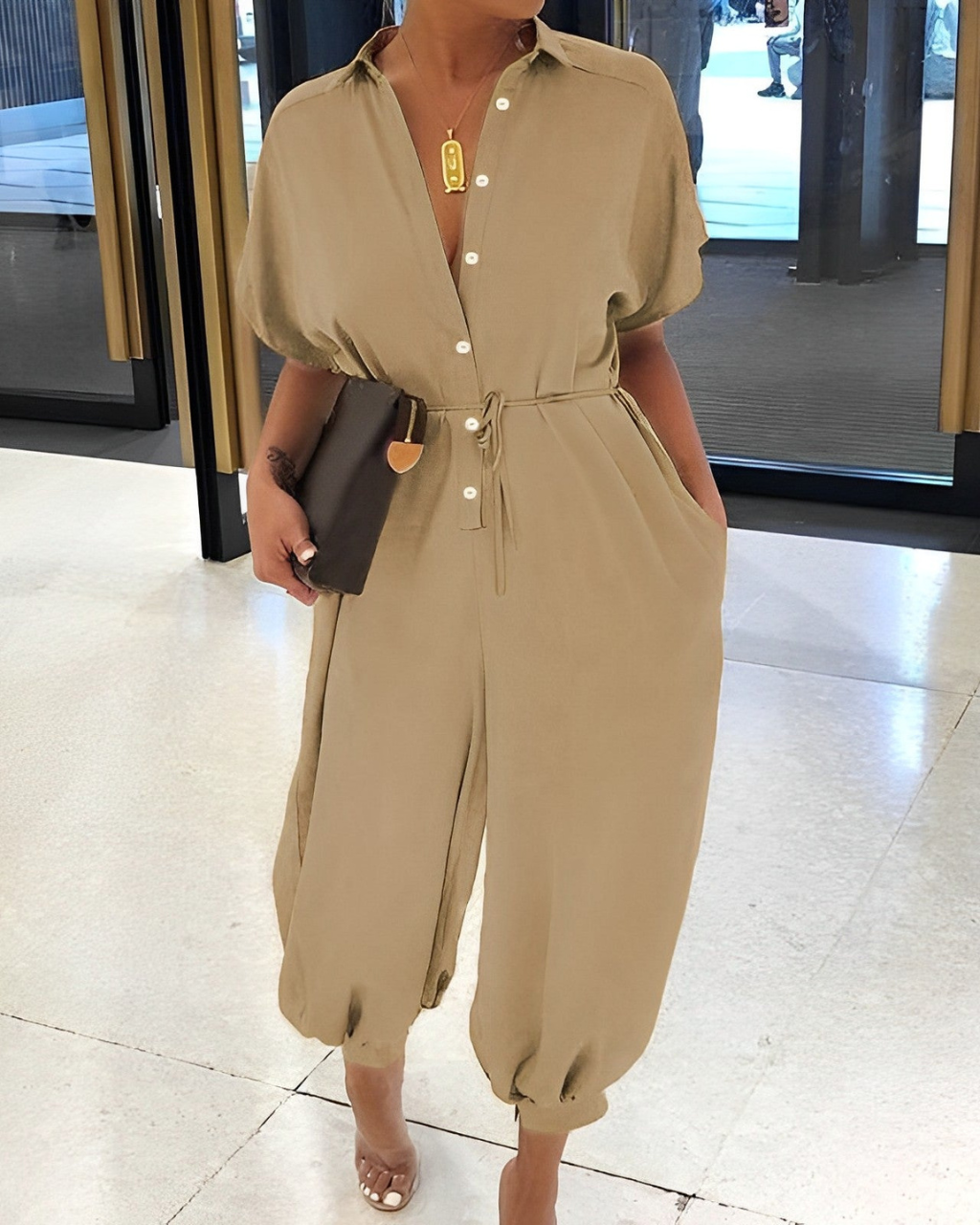Questa tuta con cintura offre uno stile moderno e una vestibilità comoda. Il suo design con bottoni e le gambe affusolate aggiungono un tocco alla moda, ideale per le vostre uscite o giornate informali.