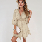 このショートドレスは、魅力的なVネックとフレアスリーブで軽やかさをもたらします。繊細な刺繍がボヘミアンで本物の精神を強調しています。流れるようなシルエットが最適な快適さと理想的な動きの自由を保証し、晴れた日々にぴったりです。
