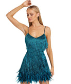 このショートドレスは、グラマラスな効果を出すためにフリンジと羽毛で飾られています。フィット感のあるカットはシルエットを引き立てます。特別な夜やイベントに最適です。