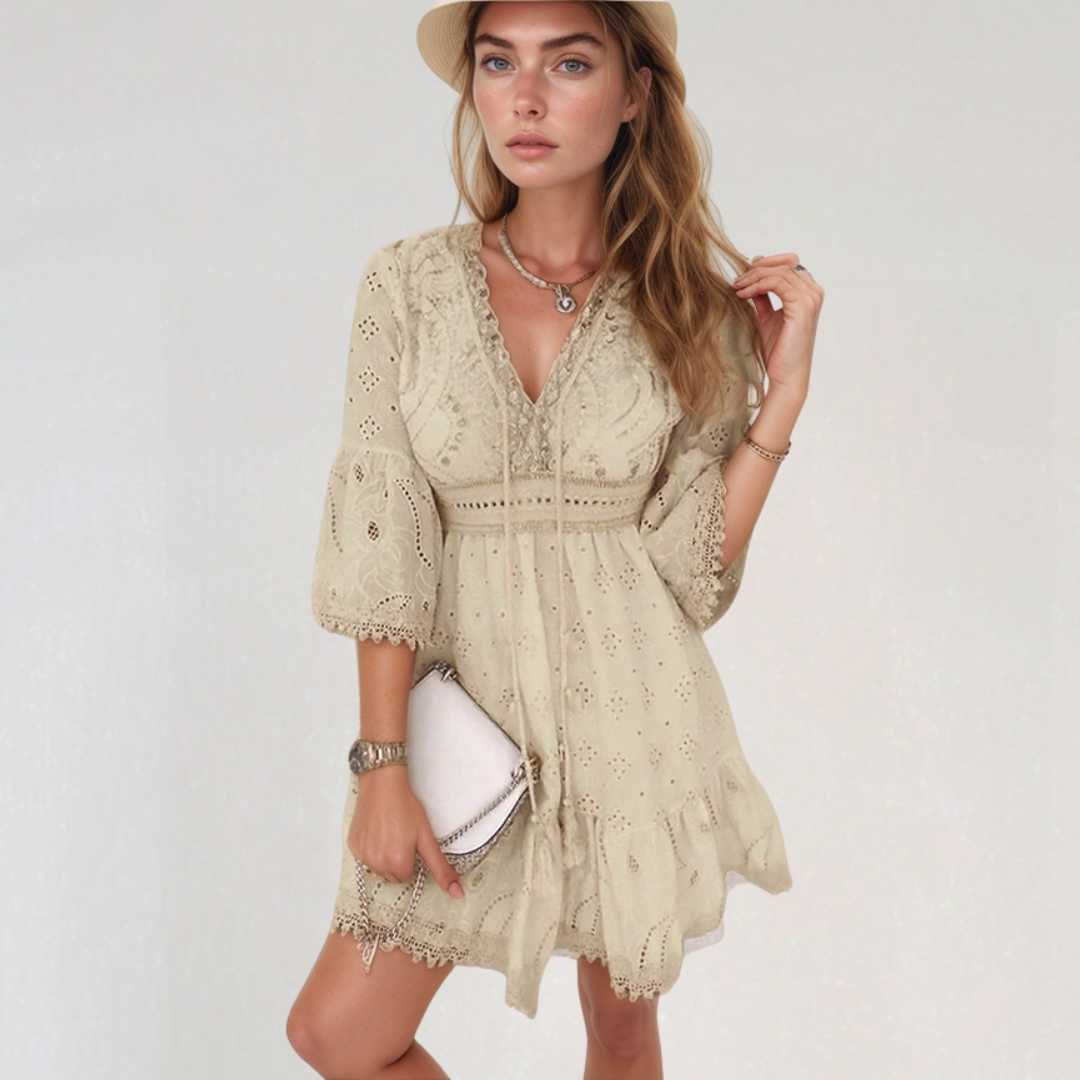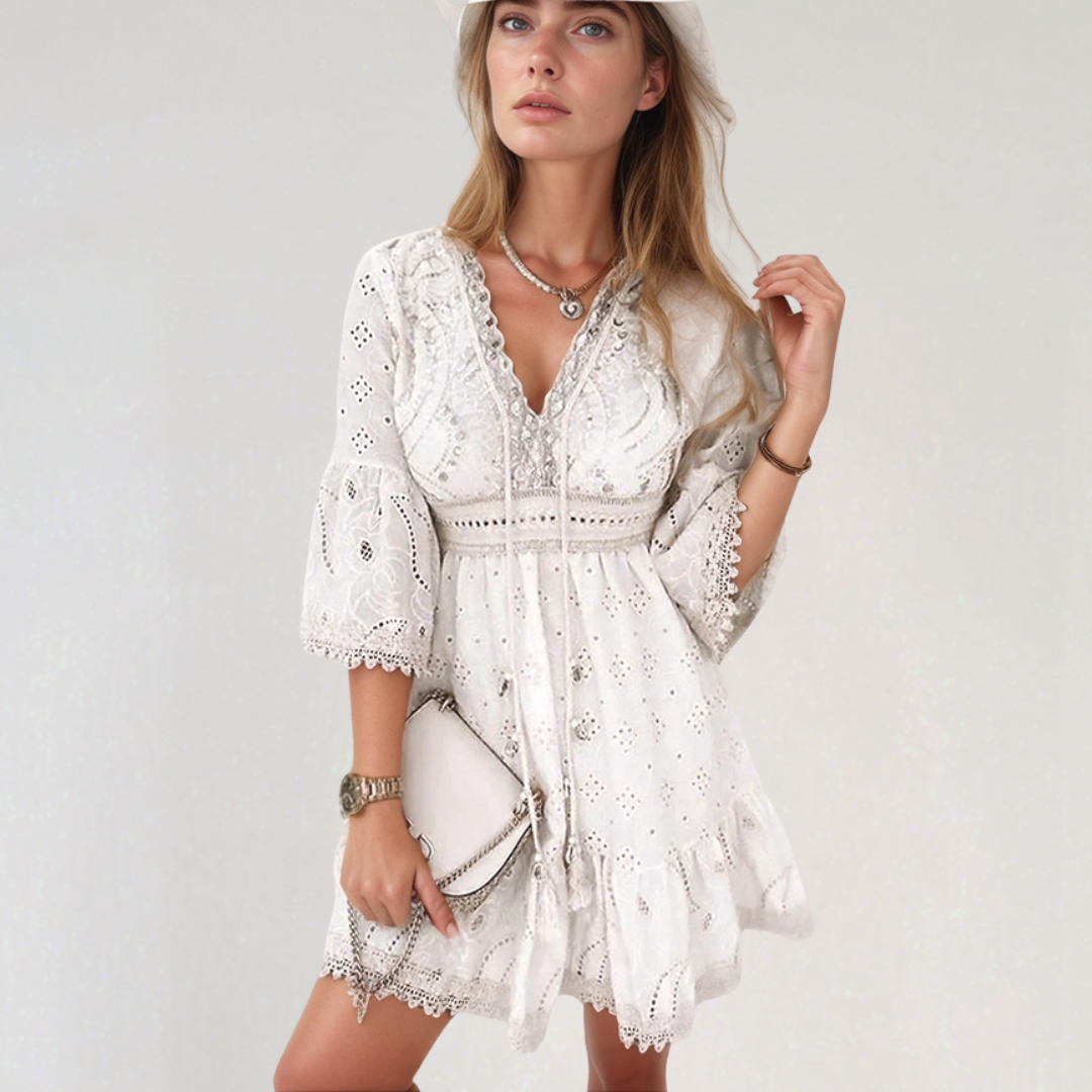 Ghislaine | Kort Bohemsk Kjole – Delikate Broderier Og V-Hals