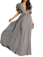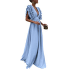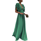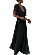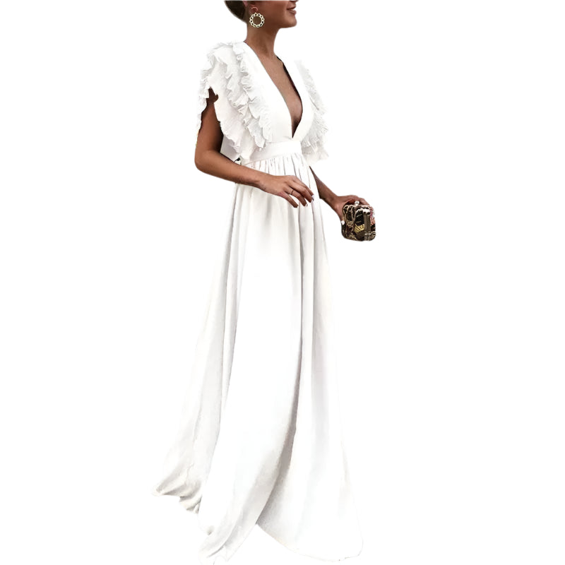 Louise | Elegant Lang Kjole med Volanger og Dyp Utringning