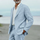 Denna tvådelade kostym förenar lätthet och elegans för att följa med dig under soliga dagar. Dess skräddarsydda passform framhäver silhuetten samtidigt som den säkerställer rörelsefrihet. Perfekt för sommarens evenemang, affärsmöten eller semi-formella tillfällen.